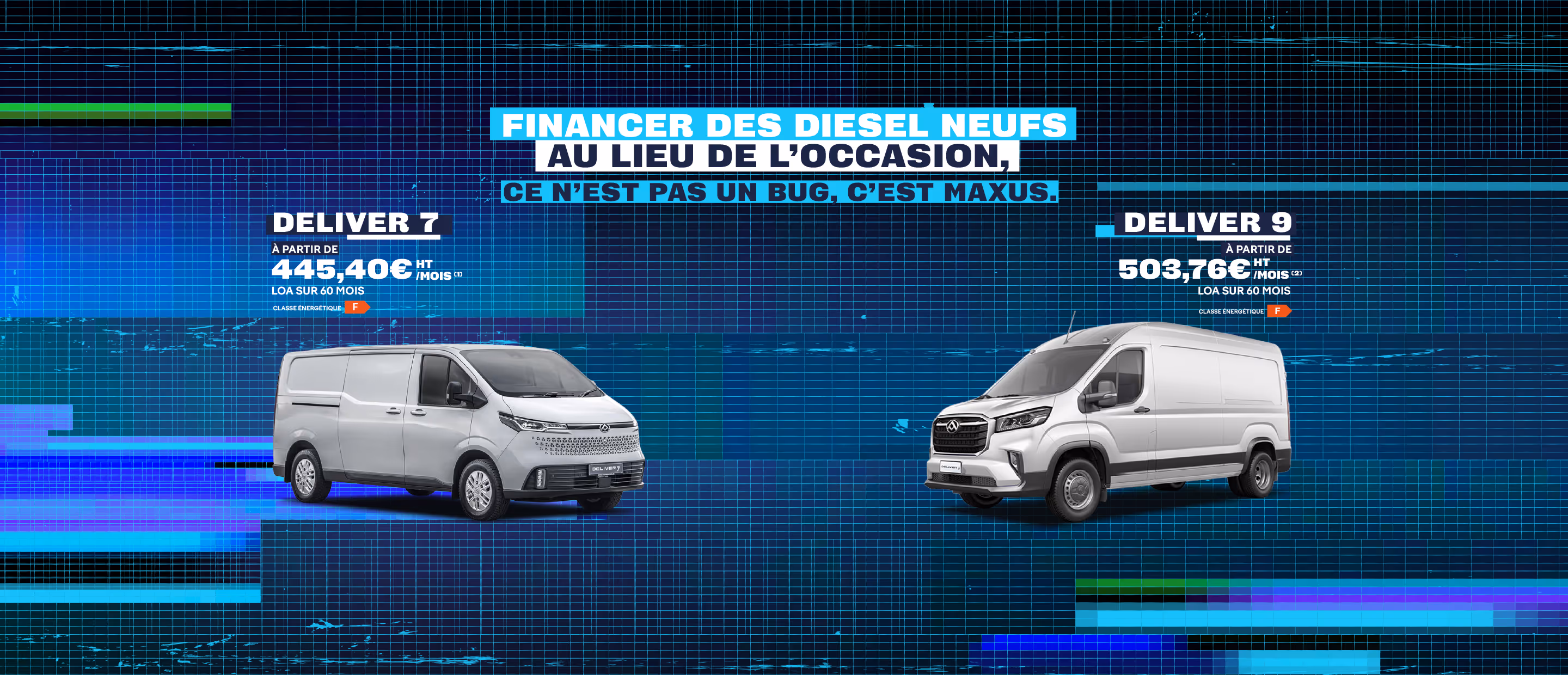 (2) Offre valable du 03/02/2026 au 31/03/2026 pour tout financement en Location avec Option d’Achat (LOA) limitée à 60 mois, modèle Deliver9 L3H2 150ch, prix d’achat 28 098€ HT. Un 1er loyer de 503.76€ HT, suivi de 3 loyers à 0€, intégralement pris en charge par MAXUS France en lieu et place du client (hors assurances et prestations facultatives), suivis de 56 loyers mensuels à 503.76€ HT. Après le paiement du dernier loyer, vous pouvez restituer votre véhicule selon les conditions prévues au contrat ou l’acquérir en levant l’option d’achat. Option d’achat finale : 4 492.87€ HT. Montant total dû avec achat en fin de contrat : 33 207.19€ HT, dont frais de dossier à 0 €. Exemple hors assurances et prestations facultatives.  Offre soumise à conditions et réservée aux professionnels, valable pour tout Deliver9 L3H2 150ch neuf commandé entre le 03/02/2026 au 31/03/2026 chez tous les distributeurs MAXUS participants (voir conditions de l’offre en concession). Sous réserve d’acceptation par CGL, Compagnie Générale de Location et d’Équipements, CGI FINANCE, SA au capital de 58 606 156 € - 69 avenue de Flandre 59708 Marcq-en-Baroeul Cedex –SIREN 303 236 186 – RCS Lille Métropole. CGL est une société du Groupe Société Générale.